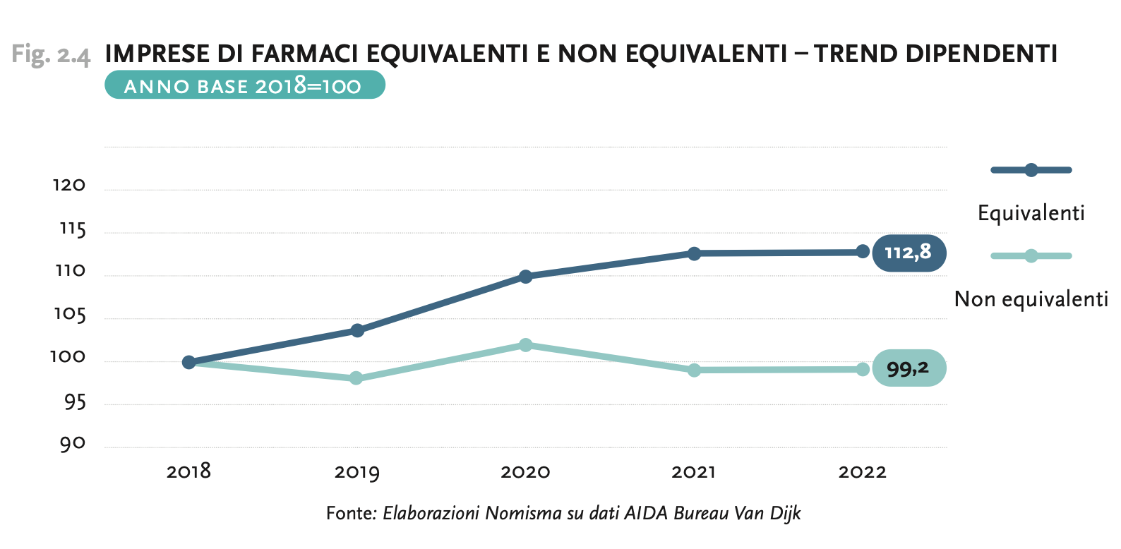 - L’effetto sulla spesa SSN: relativamente ai soli farmaci di classe A, ipotizzando che tutte le confezioni di farmaci equivalenti dispensate nel 2023 fossero state vendute ai prezzi dei brand off patent, la spesa farmaceutica sarebbe aumentata di 460 milioni di euro. Dal 2012 ad oggi la cifra avrebbe raggiunto quota 6,250 miliardi di euro.