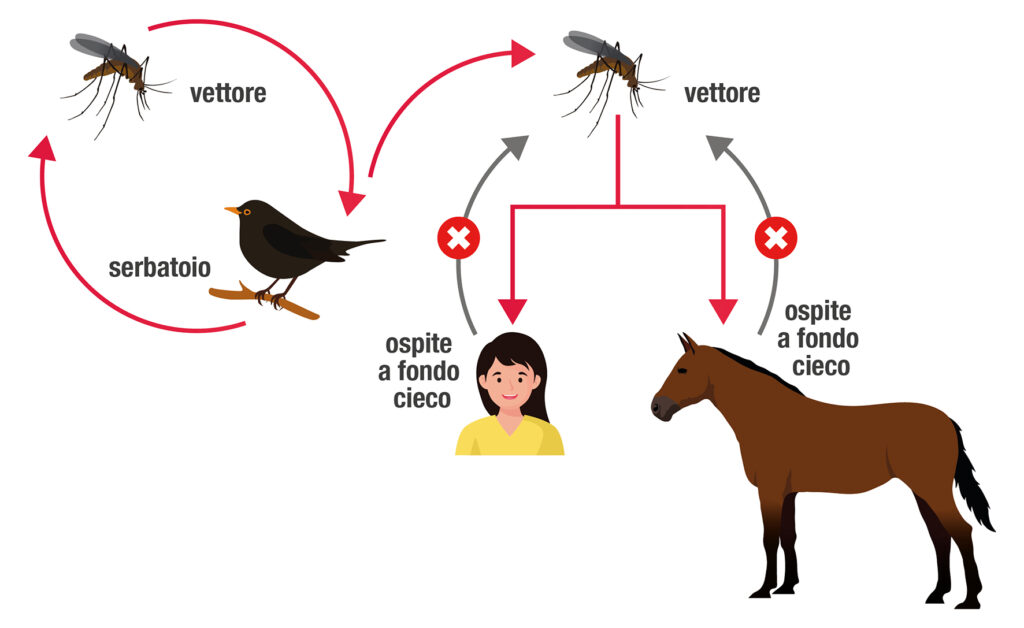 I serbatoi del virus sono gli uccelli selvatici e le zanzare (più frequentemente del tipo Culex), le cui punture sono il principale mezzo di trasmissione all’uomo