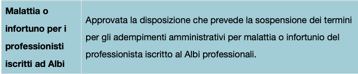 In sintesi: la novità riguarda la sospensione degli adempimenti tributari per i quali sono previste delle sanzioni pecuniarie e penali in capo al professionista iscritto ad un albo e al suo cliente. Tale sospensione scatta in caso di inabilità temporanea per più di tre giorni a causa di: