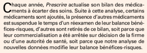 Per il settimo anno consecutivo, “Prescrire” pubblica un rapporto “farmaci da scartare per cure migliori”. Questa recensione identifica i casi di farmaci più pericolosi che utili, da eliminare dalle cure. L’obiettivo è aiutare a scegliere terapie di qualità. Prima di tutto non danneggiare i pazienti e evitare danni.