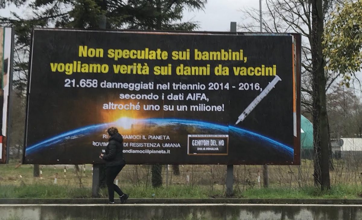 I cartelloni sei metri per tre campeggiavano per le strade più battute dell’Emilia Romagna, e recitavano “non speculate sui bambini vogliamo la verità sui vaccini” e poi riportavano un dato molto allarmante: 21.658 danneggiati nel triennio 2014-16 secondo i dati Aifa, altro che uno su un milione”.