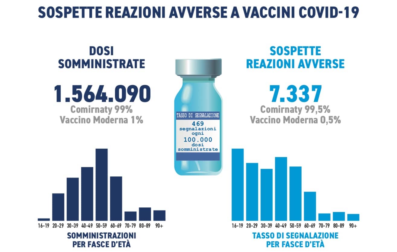 Nel periodo considerato sono pervenute 7.337 segnalazioni su un totale di 1.564.090 dosi somministrate (tasso di segnalazione di 469 ogni 100.000 dosi), di cui il 92,4% sono riferite a eventi non gravi, come dolore in sede di iniezione, febbre, astenia/stanchezza, dolori muscolari. Con Comirnaty sono state osservate anche cefalea, parestesie, vertigini, sonnolenza e disturbi del gusto mentre con il vaccino Moderna, nausea e dolori addominali.
