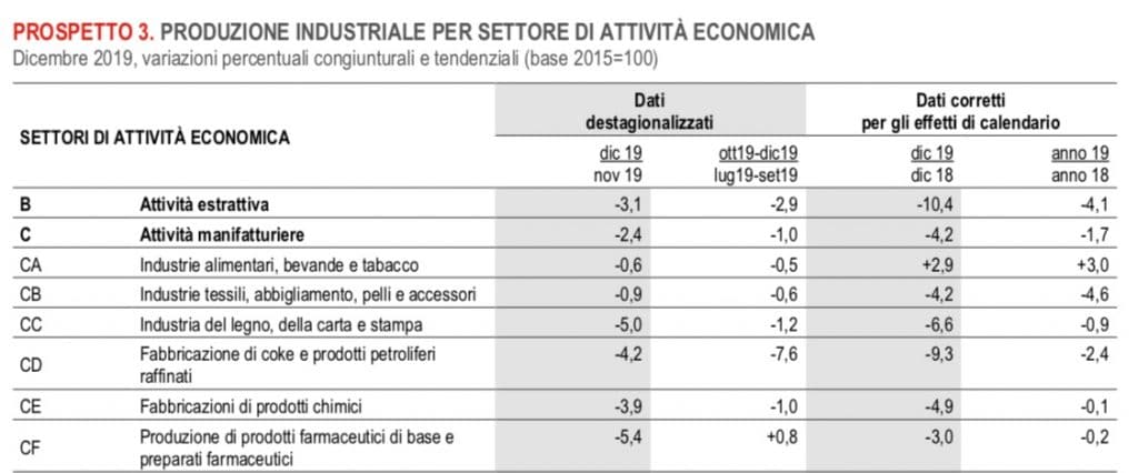A dicembre 2019 si stima che l’indice destagionalizzato della produzione industriale diminuisca del 2,7% rispetto a novembre, mentre per l’indice corretto per gli effetti di calendario si stima una flessione, in termini tendenziali, del 4,3%. I giorni lavorativi sono stati 20 contro i 19 di dicembre 2018.