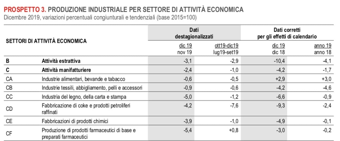 A dicembre 2019 si stima che l’indice destagionalizzato della produzione industriale diminuisca del 2,7% rispetto a novembre, mentre per l’indice corretto per gli effetti di calendario si stima una flessione, in termini tendenziali, del 4,3%. I giorni lavorativi sono stati 20 contro i 19 di dicembre 2018.
