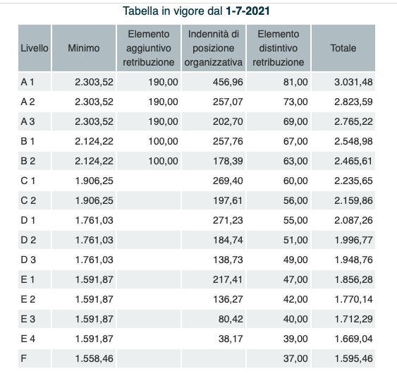 Elementi della retribuzione mensile: minimo (compresa contingenza ed edr, elemento distinto della retribuzione, nasce come compensazione all’abolizione della cd. indennità di contingenza € 10,33 ), indennità di posizione organizzativa (IPO), elemento retributivo individuale, superminimo (comprensivo degli scatti di anzianità congelati), altre voci aggiuntive sul minimo contrattuale.