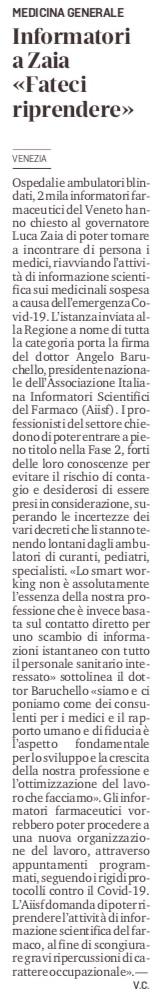 Ospedali e ambulatori blindati, 2 mila informatori scientifici del Veneto hanno chiesto al governatore Luca Zaia di poter tornare a incontrare di persona i medici, riavviando l’attività di informazione scientifica sui medicinali sospesa a causa dell’emergenza Covid-19.