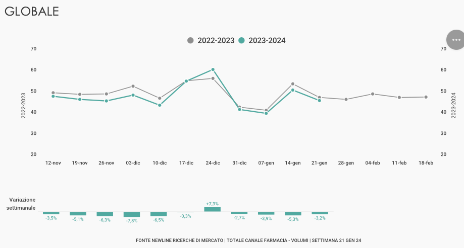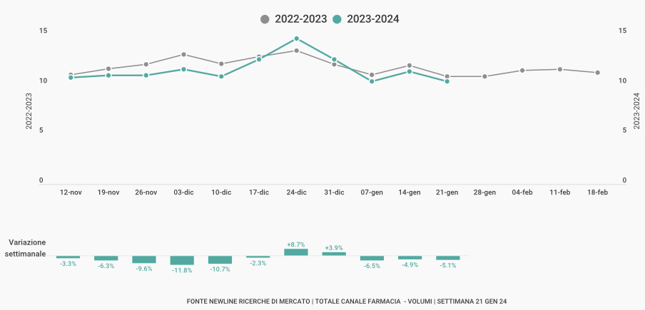Dopo il picco raggiunto a fine anno, continua il progressivo calo nelle vendite del Mercato dei Trattamenti per la Gola. Le performance eccezionali della stagione 2022-23 sono un benchmark ormai irraggiungibile e il trend stagionale cumulato non si discosta dai valori della settimana precedente (-16,8%).