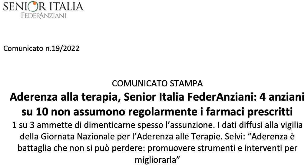 “Quella per il miglioramento dell’aderenza alla terapia è una battaglia che non si può perdere”, dichiara la Presidente Senior Italia FederAnziani Eleonora Selvi, “Basta assumere un punto di vista globale per comprenderne a pieno il valore: è impensabile che nel nostro mondo, dove esistono, fortunatamente, le migliori opportunità di cura, certo più che in paesi meno sviluppati, il deficit nell’efficacia della cura stessa possa essere dovuto alla mancata aderenza. Bisogna combattere questo fenomeno preoccupante, puntare sul rapporto di fiducia con il medico, sulla promozione di tutti gli strumenti a supporto del paziente, specie quello anziano e fragile, su campagne specifiche ed interventi che contrastino la mancata aderenza, riducendo complicanze, decessi e ottimizzando la cura”