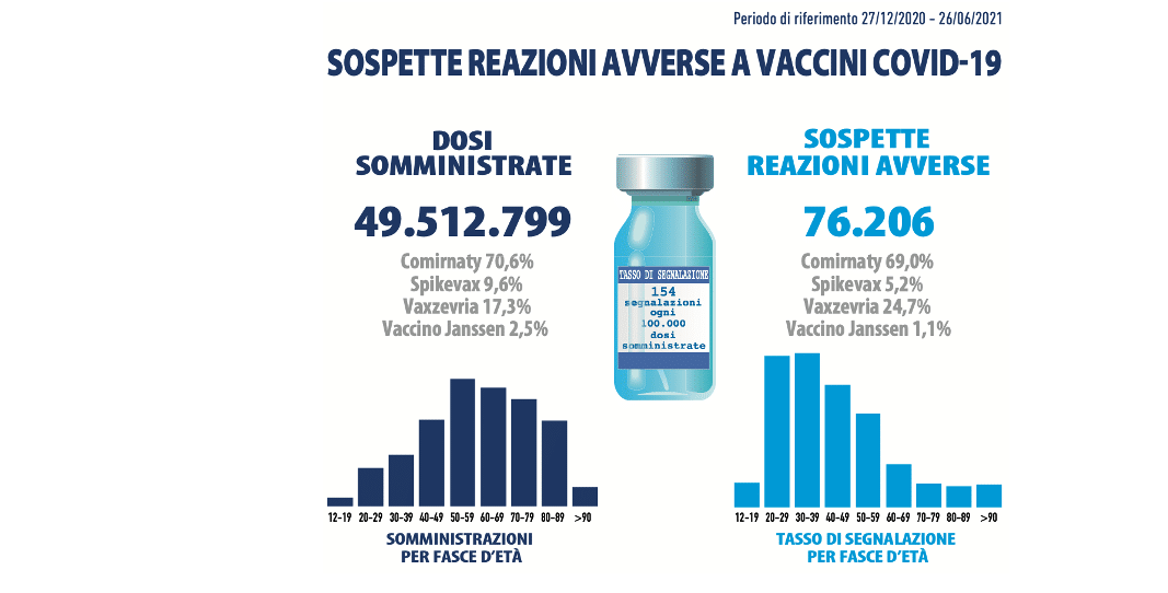 Nel periodo considerato sono pervenute 76.206 segnalazioni su un totale di 49.512.799 dosisomministrate (tasso di segnalazione di 154 ogni 100.000 dosi), di cui l’87,9% sono riferite a eventi non gravi, come dolore in sede di iniezione, febbre, astenia/stanchezza, dolori muscolari.