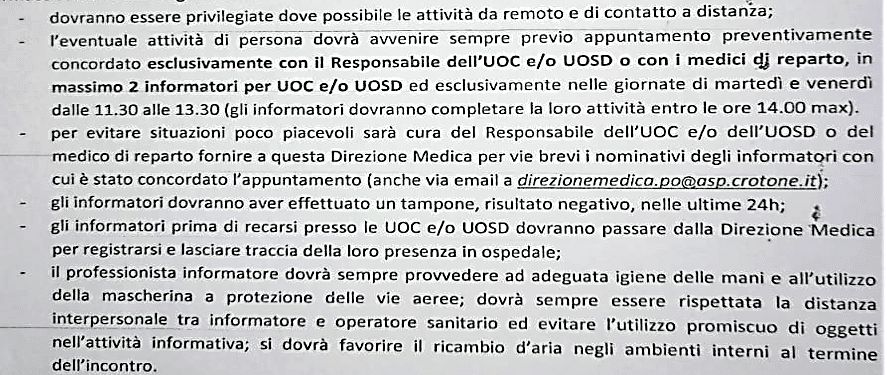 In riferimento alla sua disposizione del 28.01.2021 inerente l’accesso presso la struttura ospedaliera di Crotone degli informatori scientifici del farmaco, esprimiamo, come categoria tutta, delusione e rammarico per quanto previsto nella delibera, in quanto, in termini e in condizioni, ostativa al normale svolgimento del nostro operato.