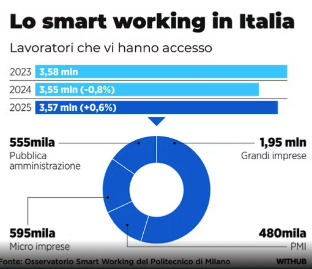 La rilevanza pratica della novella normativa si comprende appieno alla luce della diffusione strutturale del lavoro agile nel mercato del lavoro italiano. Secondo le stime dell’Osservatorio Smart Working del Politecnico di Milano, nel corso del 2025 hanno operato in modalità remota circa 3.575.000 lavoratori, con un incremento dello 0,6% rispetto all’anno precedente. Il fenomeno è trasversale: nelle grandi imprese il 53% del personale lavora da remoto (circa 1.945.000 persone), con un aumento dell’1,8%; nel settore pubblico si contano 555.000 dipendenti in smart working, pari al 17% del totale, con la crescita più significativa (+11%).