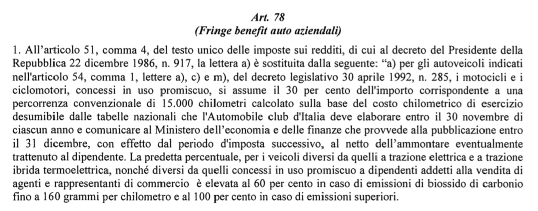 Secondo la Relazione Tecnica per circa 43 mila auto la tassa passa dal 30% al 100% e per circa 754 mila passa al 60%. L’esclusione dal raddoppio della trattenuta in busta paga non si applicherà a poco più di 42mila veicoli tra elettrici e ibridi.