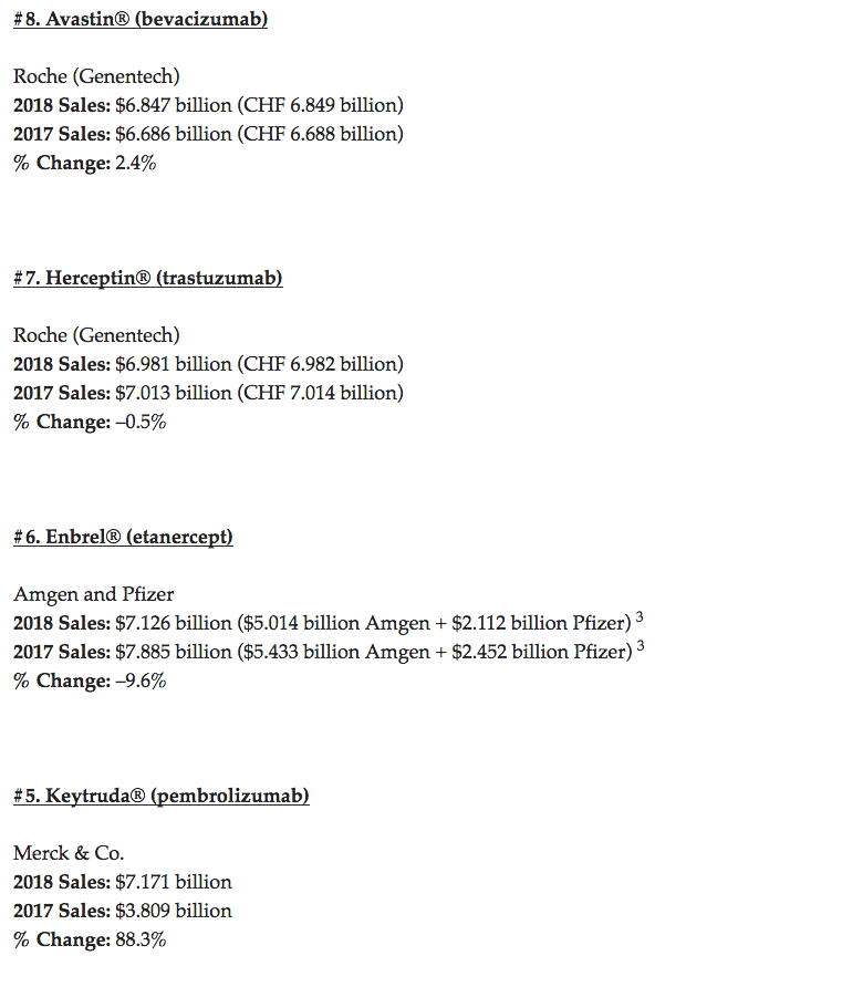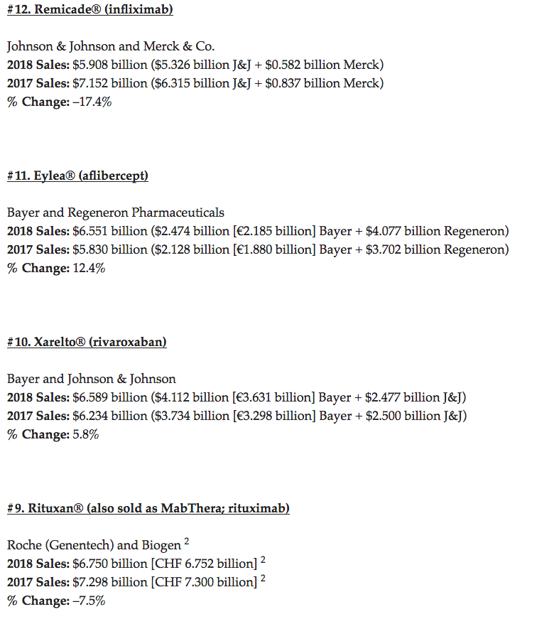 I farmaci più venduti sono classificati in base alle vendite o alle entrate registrate per il 2018 da aziende bio/farmaceutiche in comunicati stampa, relazioni annuali, materiali per gli investitori e/o teleconferenze. Ogni farmaco è elencato per nome, sponsor (s), malattie indicate, vendite 2018, vendite 2017 e la variazione percentuale tra entrambi gli anni.