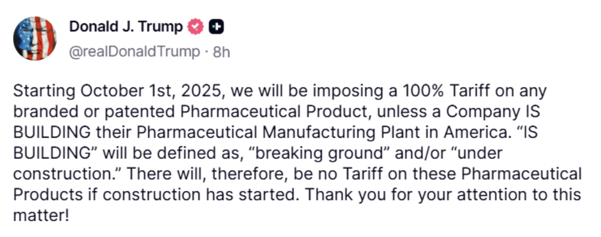 Il presidente Usa ha annunciato l’introduzione di dazi del 100% su prodotti farmaceutici di marca a partire dal primo ottobre, se le aziende del settore non trasferiranno parte della produzione negli Stati Uniti.