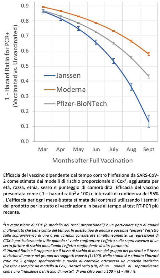 A distanza di sei mesi l’efficacia della protezione era scesa al: 13,1% per i vaccinati con il monodose a vettore virale Jannssen; al 43,3% per gli immunizzati con Pfizer-BioNTech; 58% per i vaccinati con l’altro composto sviluppato con la tecnica dell’Rna messaggero, Moderna.