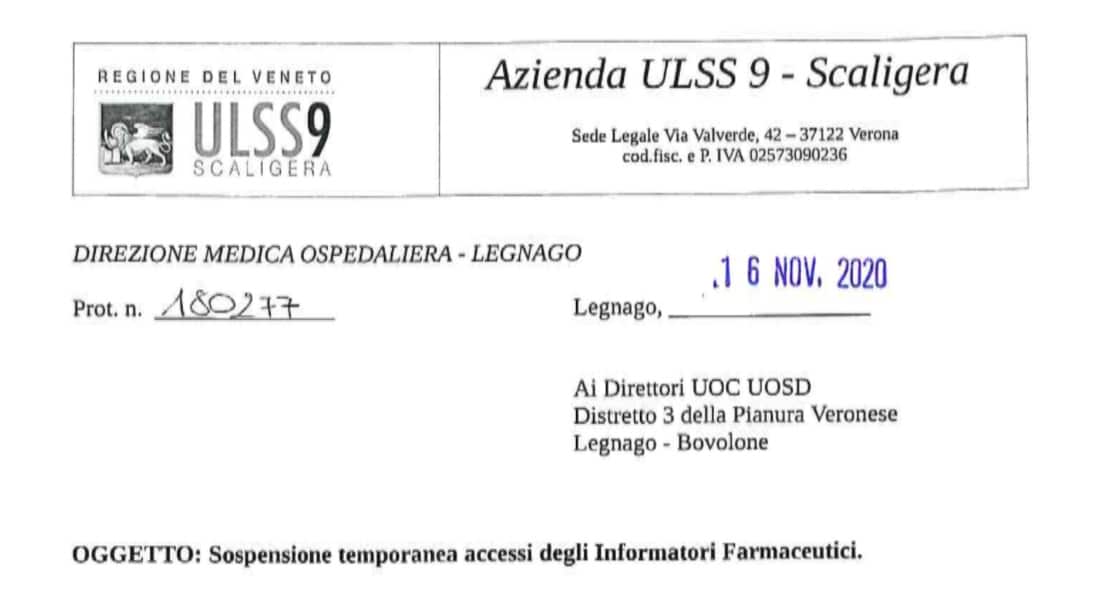 Verona. ULSS 9 Scaligera. Ospedali e ambulatori Legnago e Bovolone. Divieto accesso ISF Redazione Fedaiisf 16 Novembre 2020